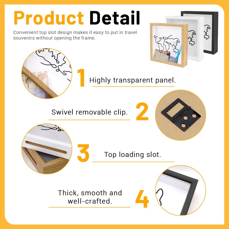 • Convenient Insertion: Our travel shadow box with slot features a square design with dimensions of 7.8" x 7.8" (20 x 20 cm). There is a slot at the top and you can directly put paper-based travel souvenirs in without opening the frame
