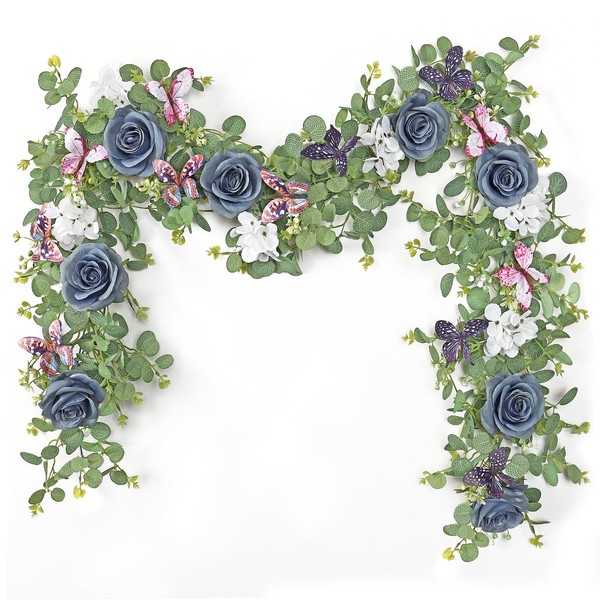 ASTNIC 2Pcs 5.9 Ft Blue Flower Garland Fake Rose Hydrangea Vines with 3D Butterflies Hanging Floral Flowers Ivy Eucalyptus Garland for Baby Shower Wedding Party Ceremony Arch Table Wall Home Decor