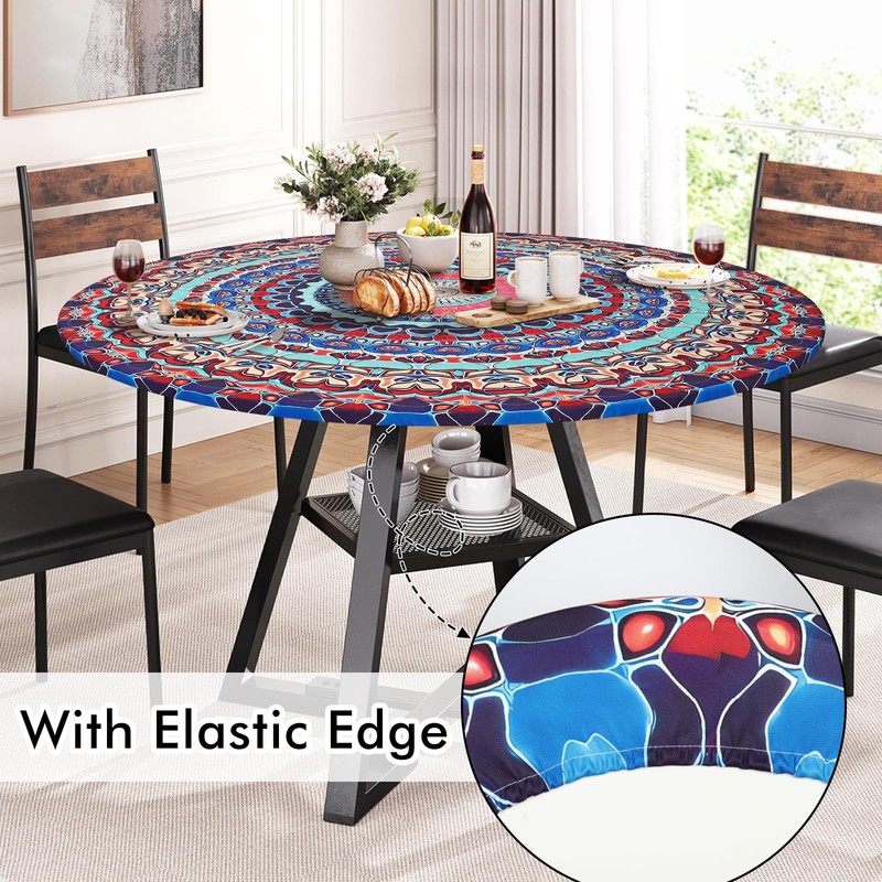 ASTNIC Round Tablecloth, Waterproof Elastic Edged Fitted Vinyl Table Cloth Washable Oil-proof Mandala Table Protector Cover for Dinning Room Kitchen Picnic (Fit 36"-44" Round Table)