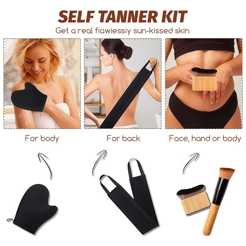 - Complete 4-in-1 Tanning Mitt Set: This set includes a self-tanning mitt, back tanner applicator, face tanning brush, and body tanning brush. It's designed to ensure that every part of your body can be reached, including those hard-to-reach areas, allowing for an even and flawless tan. The set provides everything you need for a full-body, professional-quality tan at home.