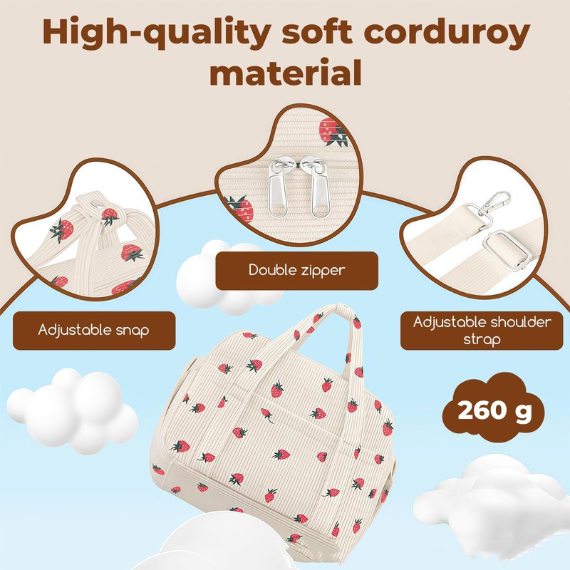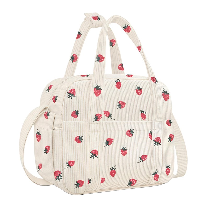 3.Stylish and Functional: This cute insulated lunch bag made of soft corduroy isn't just functional, it's a fashion statement. Featuring a charming strawberry design, it complements any outfit whether you're heading to work or enjoying a casual day out with friends. Ideal for both women and men.