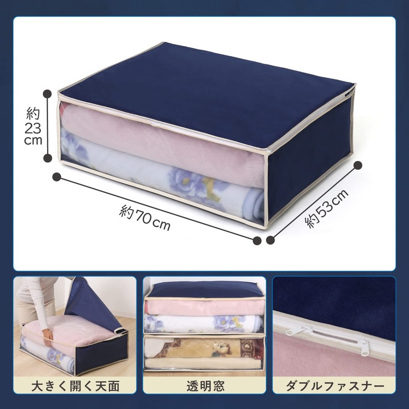 - Product Specifications: Size (W x D x H): Approx. 27.6 x 20.9 x 9.1 inches (70 x 53 x 23 cm); Color: Navy, Contents: 1 piece, Storage: Approx. 1 - 2 thick blankets, approximately 3 - 4 sheets for thin blankets, Material: Polypropylene, polyethylene