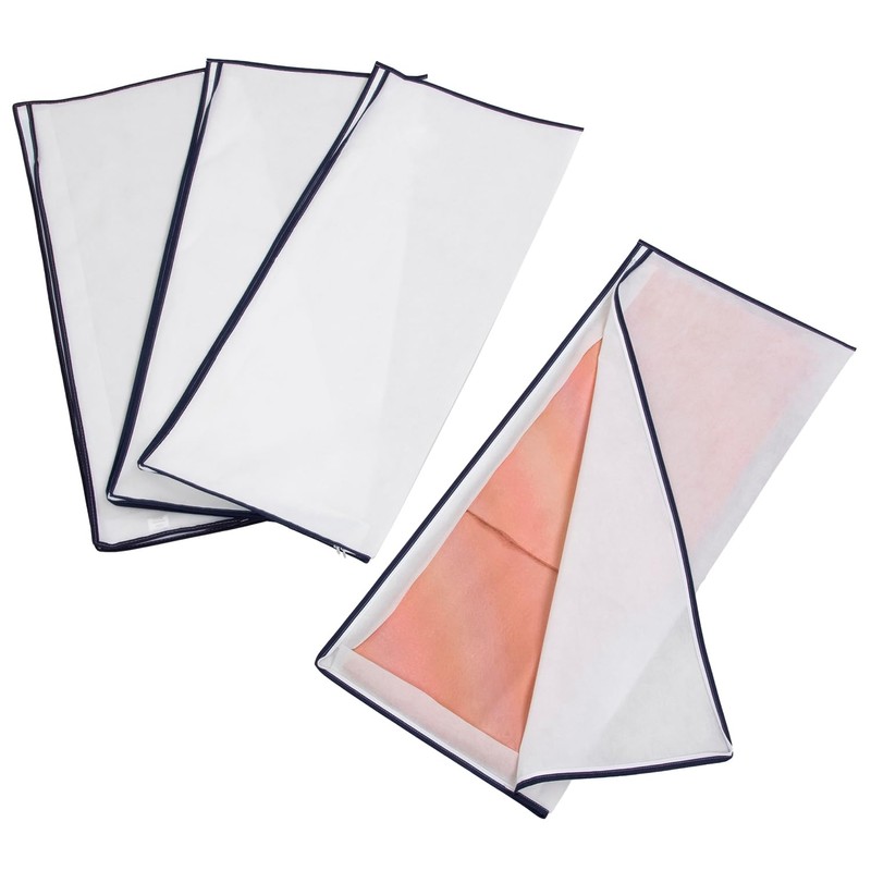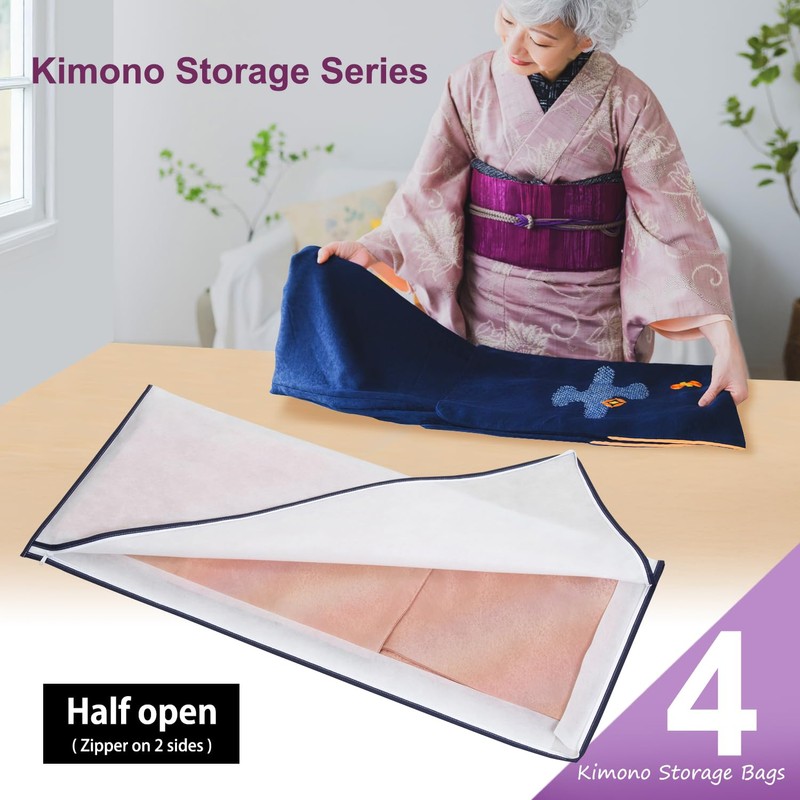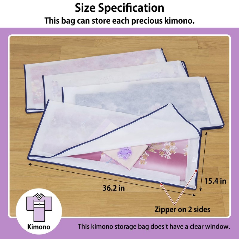 【Product Specifications】: Size/Approximately 15.35 inches (width) × 36.22 inches (length), Color/White, Contents/4 sheets, Storage Capacity (per bag)/1 kimono (yukata) per sheet, Material/Polypropylene. 【Stored in Highly Breathable Non-woven Fabric】: Crafted from breathable non-woven fabric that effectively prevents moisture buildup and odors, ensuring the protection of your precious kimono from dust. 【Durable, Lightweight, and Soft】: Made from sturdy yet lightweight non-woven fabric, these sheets are tear-resistant and easy to handle compared to traditional wrapping paper. 【Prevents Zipper Snags】: Equipped with double-zipper fasteners that open in an L shape, featuring a fabric cover to prevent the kimono from getting caught in the zipper during opening and closing. 【Moderate Transparency and Foldable】: Offers a moderate level of transparency, allowing you to easily check the pattern of the kimono inside. When not in use, they can be folded to save space and stored in a slim manner.