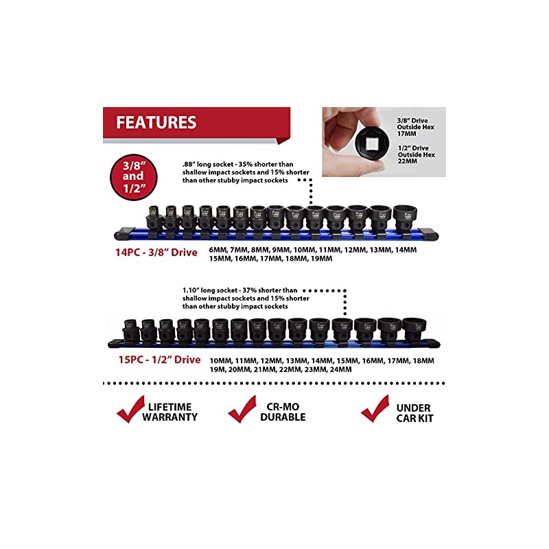 • Set Includes - 14 pc 3/8" Drive 78314 and 15 pc 78215 1/2" Drive Nano Impact Sockets - Metric