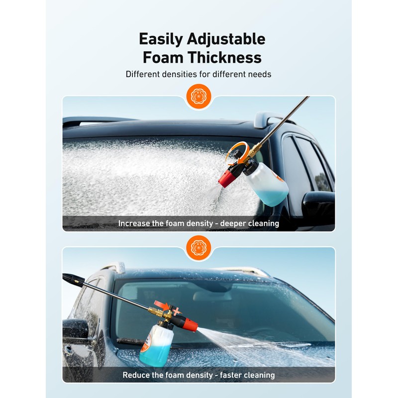 - Adjustable Nozzle for Thick foam and Spray pattern: Mix detergent and water and connect the cannon to the pressure washer. Turn the top knob right (-) to get the thickest mixture; Adjust the spray nozzle to get a proper sprinkle pattern. The nozzle holder allows the user to rotate 360-degrees to control the dispersing direction.