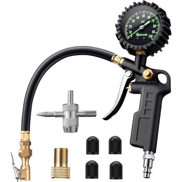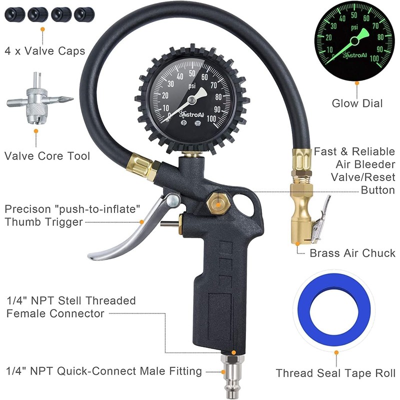 - UNIVERSAL COMPATIBILITY: Compatible with cars, trucks, SUVs, motorcycles, bicycles, or anything else that utilizes a schrader valve; Easy to read 2.5" glow-in-the-dark dial makes everything easier as well