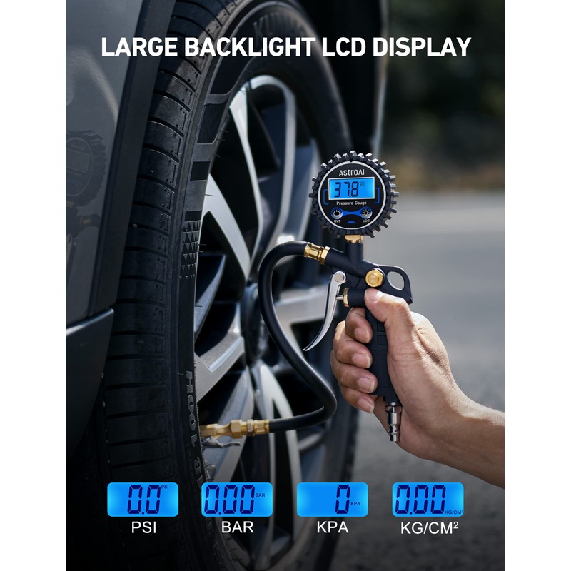- ALL-IN-ONE FEATURES: AstroAI tire pressure gauge Includes an inflator, straight locking chuck, gauge, hose, and bleed valve, all in one unit with function of deflation, inflation, tire pressure check. Compatible with both ¼” and ½” NPT air compressors outputs.