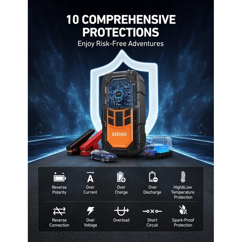 - 【ENHANCED SAFETY & QUALITY】The AstroAI S8 Air Nano Jump Starter is equipped with 10 built-in protections to prevent misoperation, ensuring compliance with national UL and FCC Certifications. Its durable ABS housing can withstand accidental drops, while its honeycomb vent design reduces the jump starter’s temperature by 30%, allowing heat to dissipate quickly. Note: The air tube will be hot after inflation; please wait for it to cool down before removal.