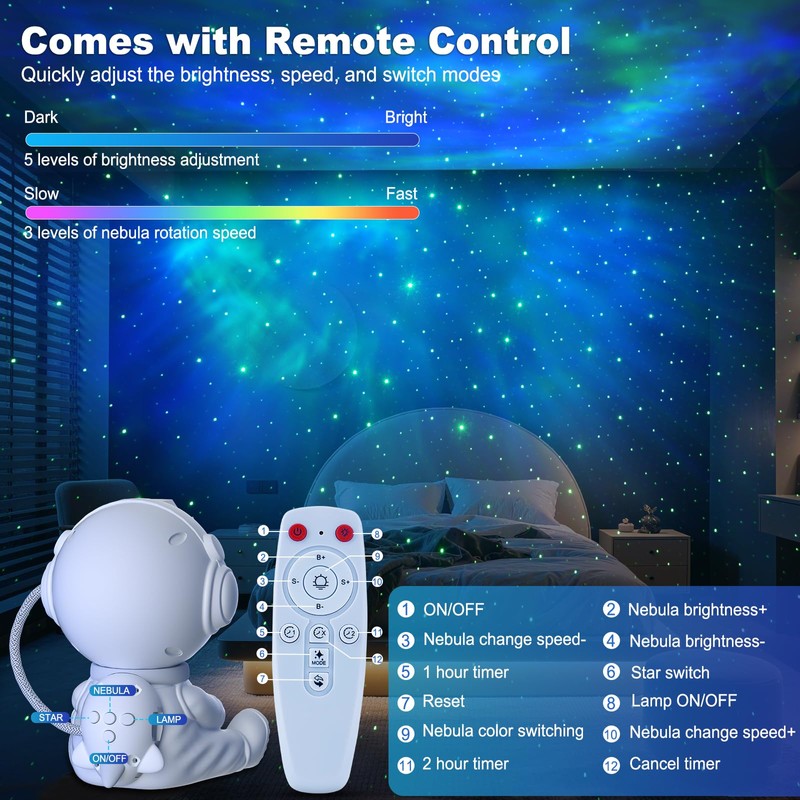 - 【Remote Control & Timer】The starry sky light has two control methods: button and remote control. The button on the back can only turn on the light, switch the nebula and starry sky mode, long press to turn off; The remote control can adjust the color, brightness and flashing frequency of the nebula and star, You can project star and nebula together or separately. Set a 60 or 120 minute timer and let the astronaut projector auto turn off—perfect for bedtime or relaxing under a magical night sky.