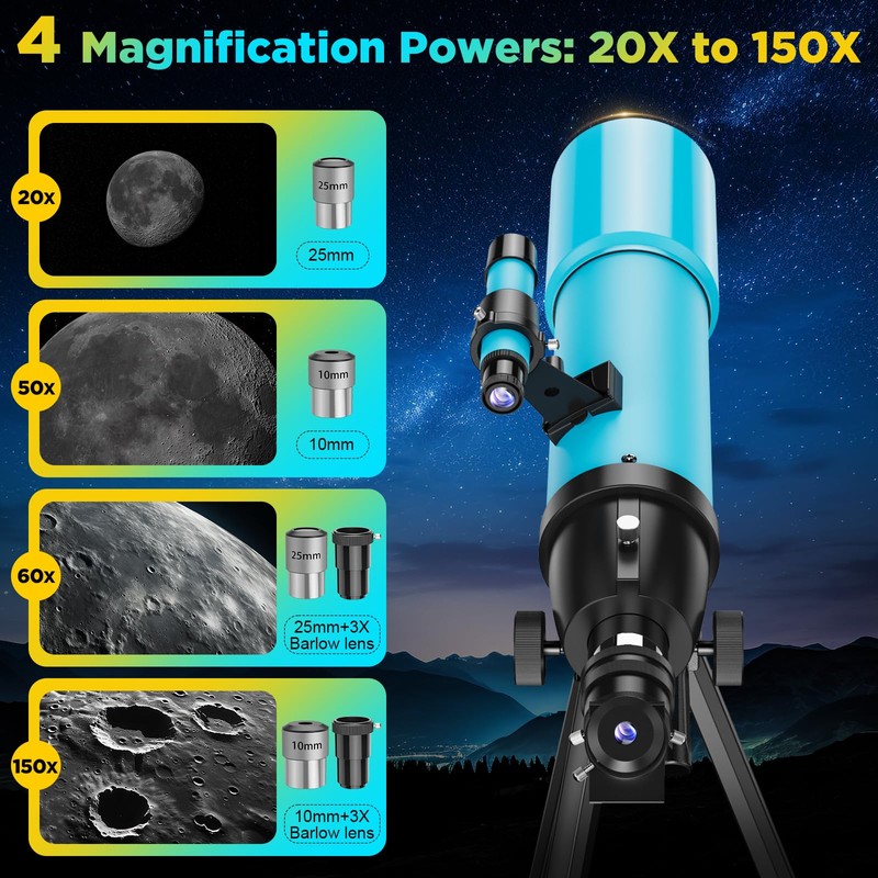 - Powerful Magnification & Lunar Viewing: Equipped with premium 25mm & 10mm eyepieces (20X & 50X) and a 3x Barlow lens, boosting magnification to 60X, 150X for detailed lunar and planetary observation. A 5x24 finder scope ensures swift celestial target acquisition.