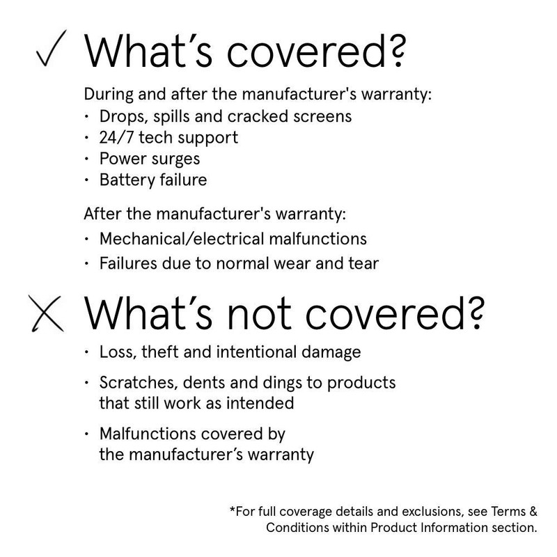 - Product Eligibility: Plan must be purchased with a product or within 30 days of the product purchase. Pre-existing conditions are not covered.