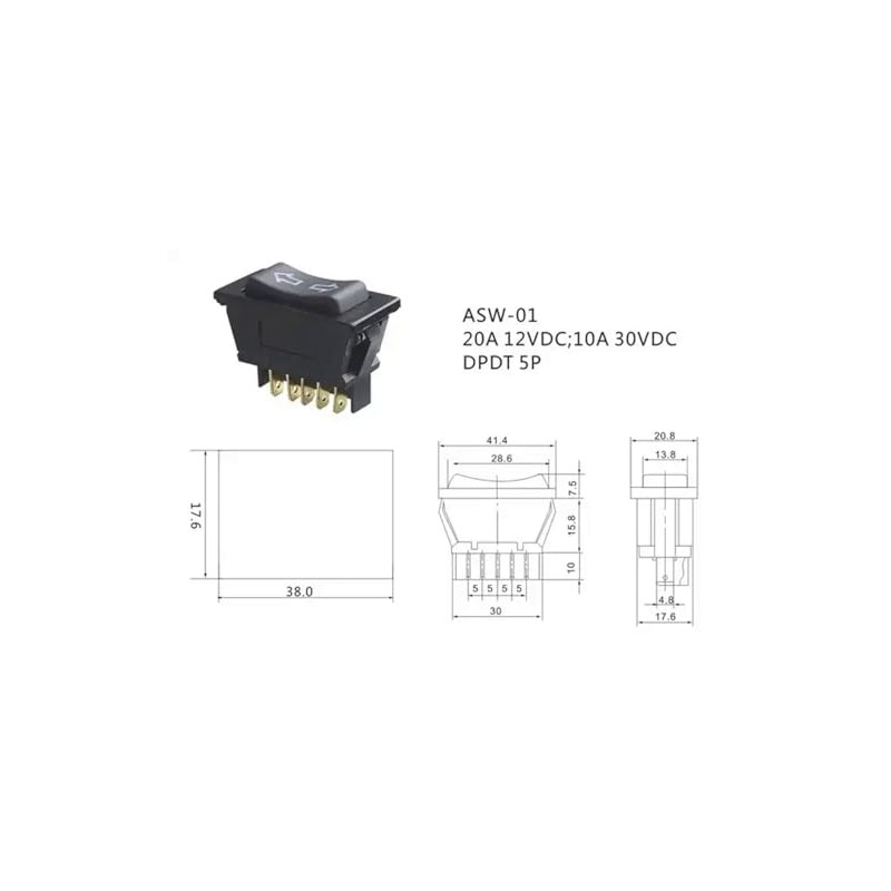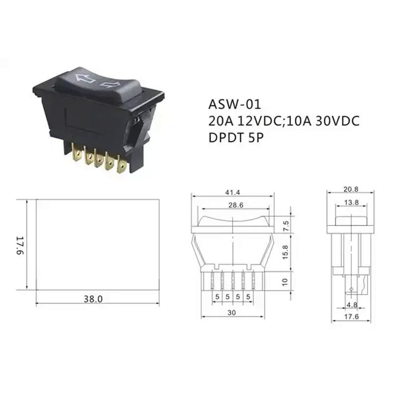 - The ASW-01 electric window regulator rocker switch has a snap-in mounting for easy operation, installation dimensions 38 x 17.6 mm blade connections, 4.8 mm pitch 5 mm, frame dimensions L x W: 41.4 x 20.8 mm, height 33 mm. It can be installed firmly while keeping the surface beautiful. The double arrow mode makes it easier to use. 20A @ 12V DC, 10A @ 30V DC.