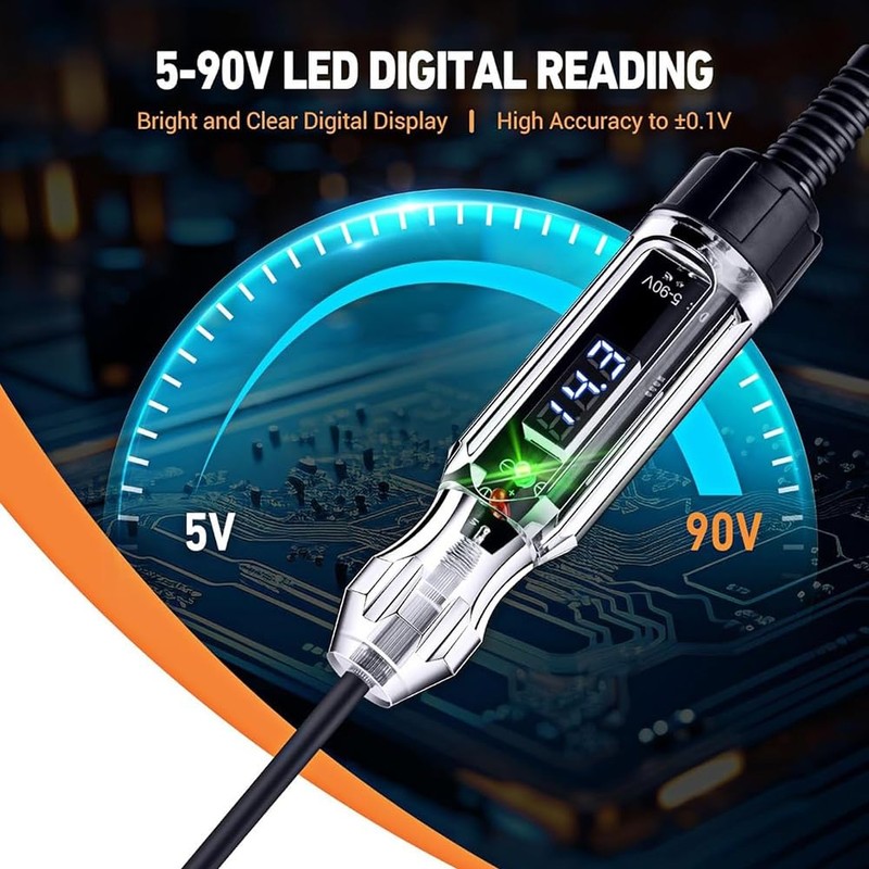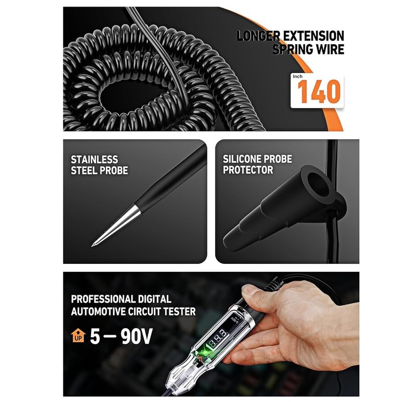 • The professional 5-90V LED voltage tester pen is perfect for checking automotive headlights, taillights, turn signal circuits, faulty sockets, fuse connections, broken wires, etc. It is suitable for boats, trailers, bulldozer, road roller, motorcycles and various circuits.