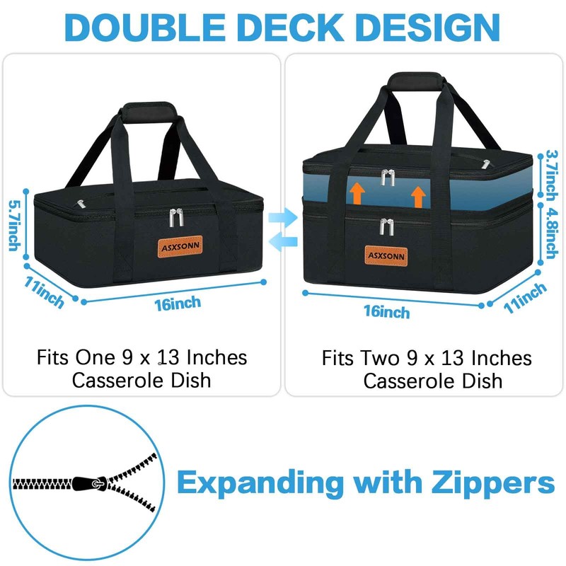 ASXSONN Double Decker Insulated Casserole Carrier for Hot or Cold Food, Expandable Insulated Food Carrier for Parties, Picnic, Beach, Fits 9"x13" Baking Dish (Black)
