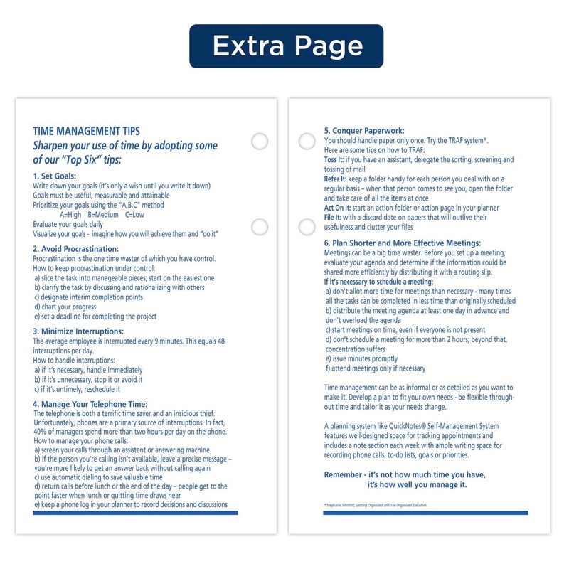 • DAILY VIEWS – Each day covers a two page spread. The left page is ruled for half-hour appointments 7:00 a.m. – 5:00 p.m., while the right page has a QuickNotes writing area. Pages measure 3 1/2" x 6".