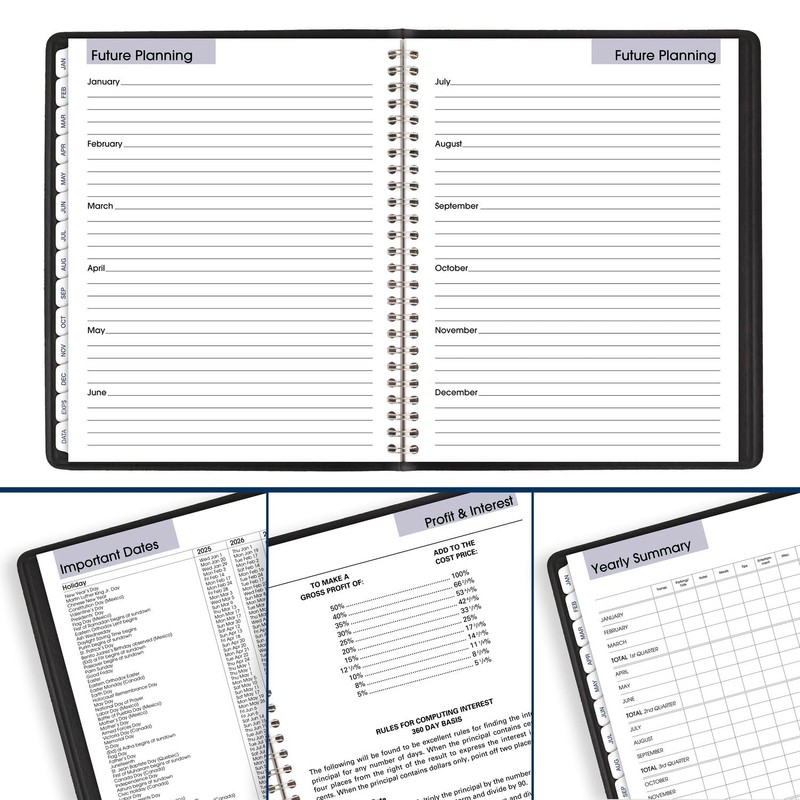 - MONTHLY OVERVIEWS – Monthly spread features unruled daily blocks for open scheduling on one page and ruled notes space on the other. Months are tabbed for easy navigation.