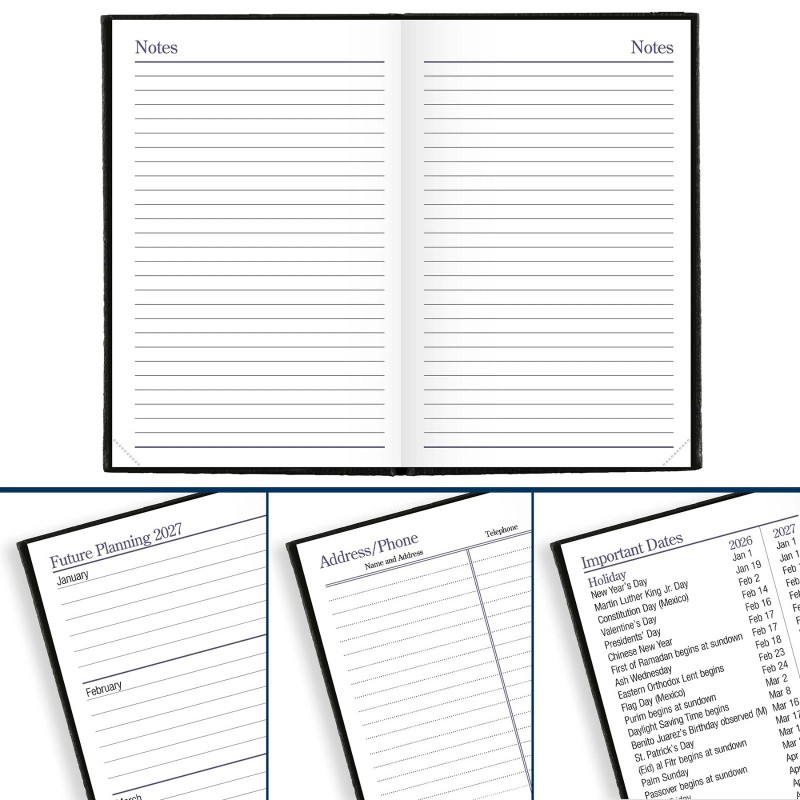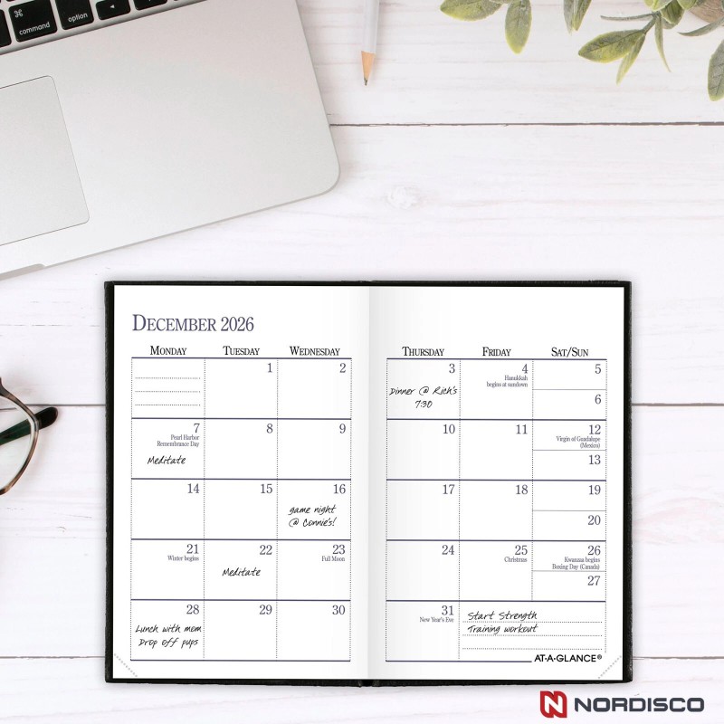 2026 At-A-Glance 72-01 72-01-05 Fine Diary Weekly Monthly Planner, 2-3/4 x 4-1/4" available at Nordisco.com. ACCO Brands At-A-Glance Pocket Diary covers a 12-month date range from January 2026 through December 2026 with Julian dates. Weekly section has one week per two-page spread has ruled planning space for each day and 2 monthly reference calendars. Monthly section has one month per two-page spread has unruled daily blocks, with half size blocks for Saturday and Sunday. Bonus pages include future year planning, telephone/address pages and reference pages. Perforated page corners make it easy to navigate, opening quickly to the right week and month. Black durable hardcover is made to last and stands up to wear and tear. Casebound binding prevents snags and secures pages.