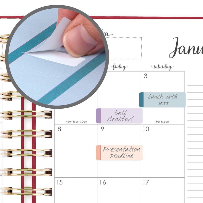 - SPECIAL PAGES – Includes: holiday list, 3-year reference calendar, future planning, gift ideas, birthdays/important dates, contacts, expense tracking, notes, a double-sided storage pocket and color-coded repositionable stickers for project tracking.