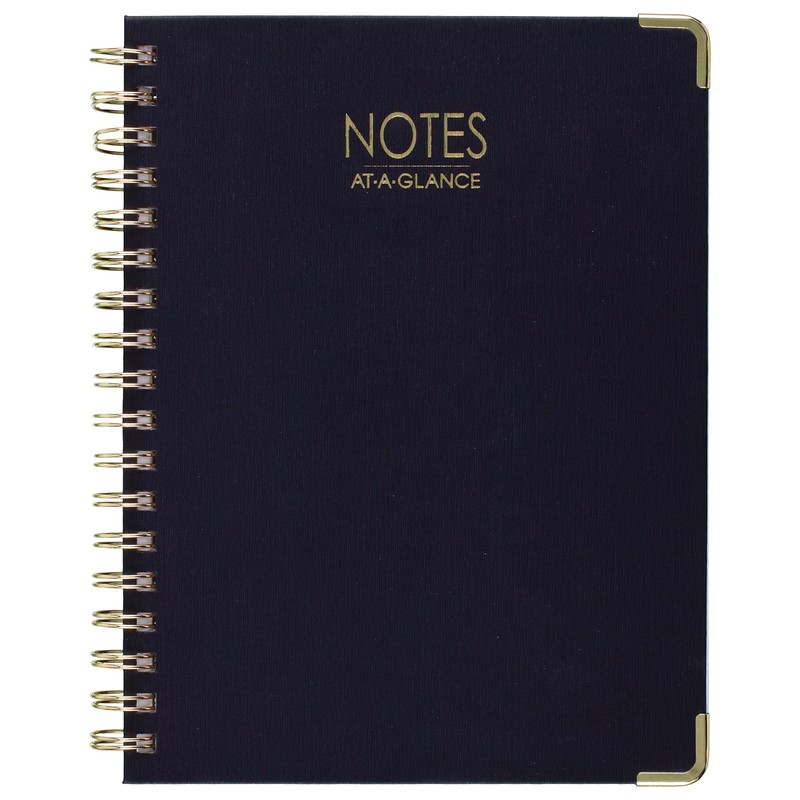 The At-A-Glance harmony notebook features Blue faux-leather covers with gold foil accents and gold corners for a high-quality, stylish look. Its ruled pages keep handwriting neatly aligned so notes are easy to read. Pages also have sections to list priorities, make checklists, track goals, plan for the future and reflect on "wins of the day". a date section in the top right hand corner of each page lets you quickly refer back to old entries. Pages are perforated to create a clean edge when you need to tear notes out. Wire binding keeps pages securely held together-noo need to worry about losing sheets. Includes 80 double-sided sheets for 160 pages of notes. The notebook’s 6-1/2" x 9-1/2" page size is perfect for notetaking at your desk or on the go.
