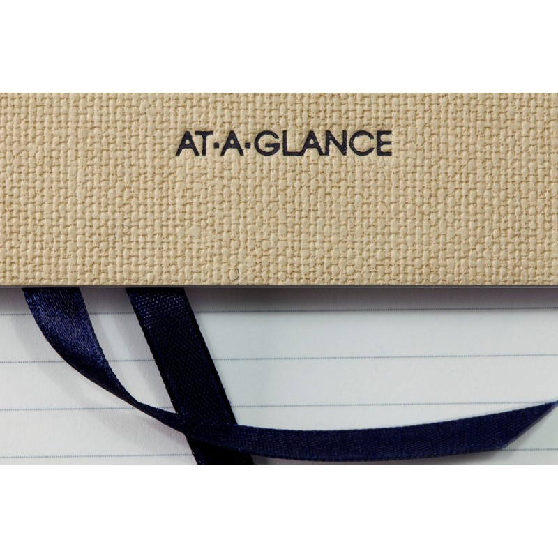 At-A-Glance collection notebook is perfect for business meetings, project notes, personal reminders and more. Ruled notebook paper keeps writing aligned so notes are neat and easy to read. Designated section for date included in the top right hand corner of every page for future reference. Task section at the bottom separates key takeaways from other notes to prioritize. Two, navy Blue, ribbon page markers are included to mark current page and/or frequently referenced notes. Navy Blue, fabric covered spine gives the notebook a smooth edge and case bound binding keeps pages Permanently secured. The durable notebook covers have a textured feel and are rigid to protect notes over time. Tan cover color is accented by the navy spine while title and logo on front are printed in a matte navy Blue. Business notebook includes 80 sheets of double-sided, ruled notebook paper for a total of 160 pages. 9-1/2” x 7-1/2” page size. Part of the At-A-Glance collection line of products.