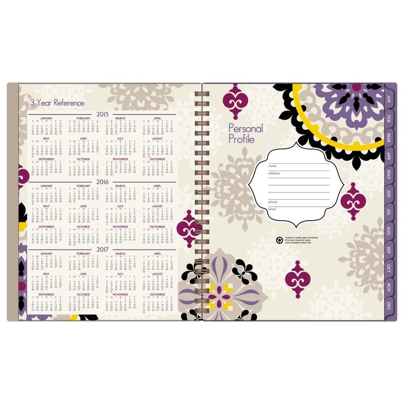 Weekly/monthly calendar features a classic medallion design that is given a twist when paired with vibrant colors. Dated planning pages range 12 months from January to December. Wirebound planner is tabbed for quick reference and navigation and provides equal space for weekdays and weekends. Two-page-per-week spreads offer ruled daily entries, Monday-through-Sunday scheduling and count of days/days remaining. Two-page-per-month spreads include unruled daily blocks, Sunday-through-Saturday scheduling, ruled notes column, count of days/days remaining, holidays, and past and future months reference. Special sections include holiday listing, three-year overview calendars, event calendar, contacts and notes.