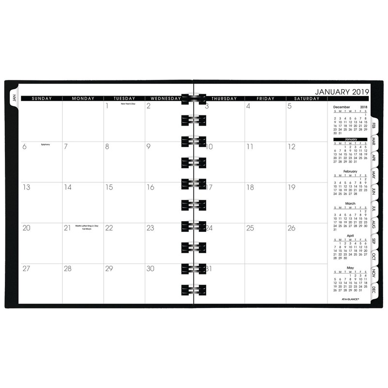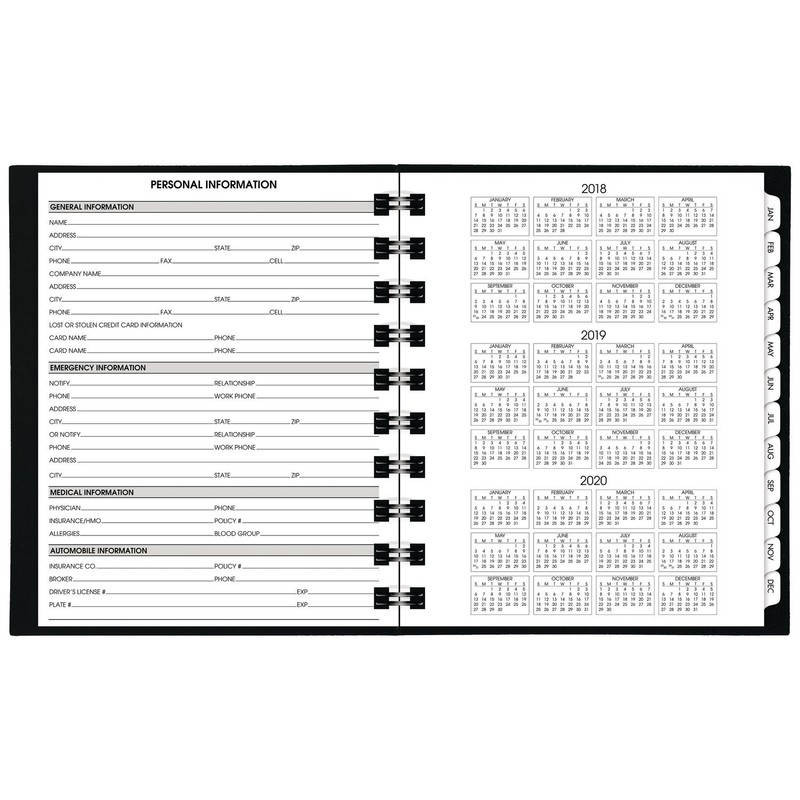 • Tabbed months and unruled daily blocks. Past, current and four future months reference. Black Poly cover with bungee closure. Wirebound. 8-3/4" x 11" page size.