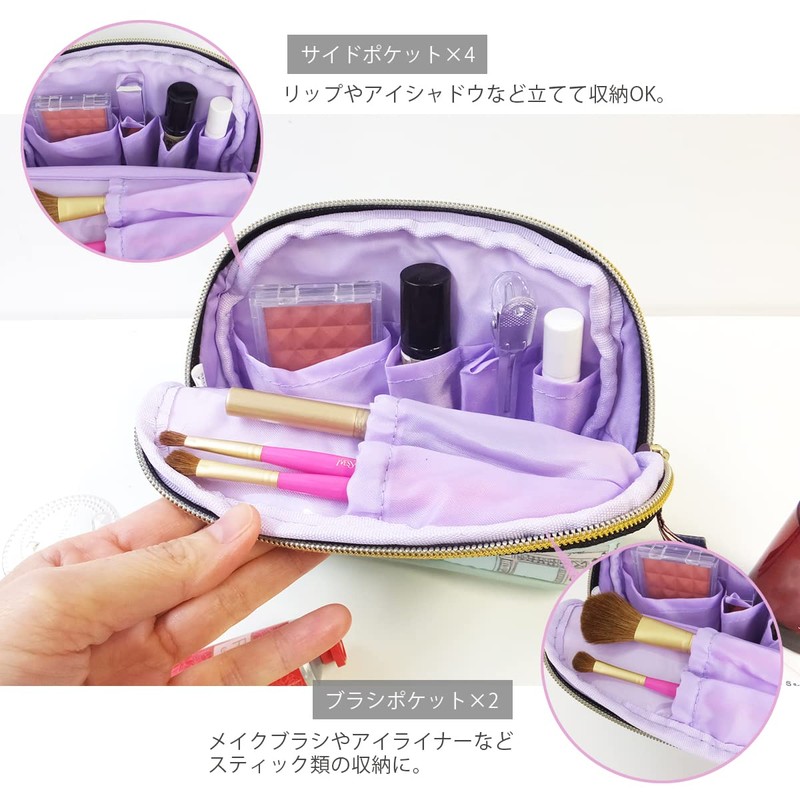 - This makeup pouch comes with a slim brush pouch that can be used on its own and is easy to use. Easy to use and free standing design, fashionable cosmetic pouch The mouth opens wide, making it easy to see and retrieve the contents. The bottom is made of synthetic leather, so it will not lose its shape