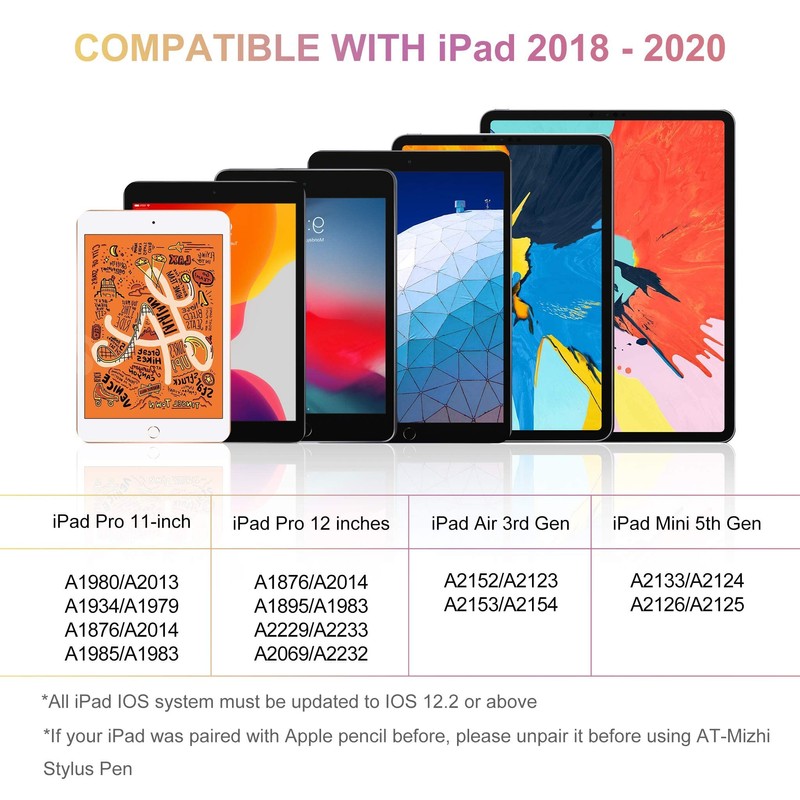 - 💝【Designed for use on iPads 2018-2022 & iPad Pro】 This AT-Mizhi apple pencil 2nd generation is compatible with iPad 6/7/ 8th generation, iPad Pro (11 ") 1st / 2nd / 3rd generation, iPad Pro (12.9") 3rd generation. / 4th / 5th generation, iPad Mini 5th/6th Gen, iPad Air 3rd / 4th generation Generation - 💛 stylus pen for iPad NOT COMPATIBLE with iPad Pro 12.9 "1st and 2nd, iPad Pro 9.7" & Pro 10.5 "and iPhone / Android. Please confirm your devices before placing an order, other models are invalid.
