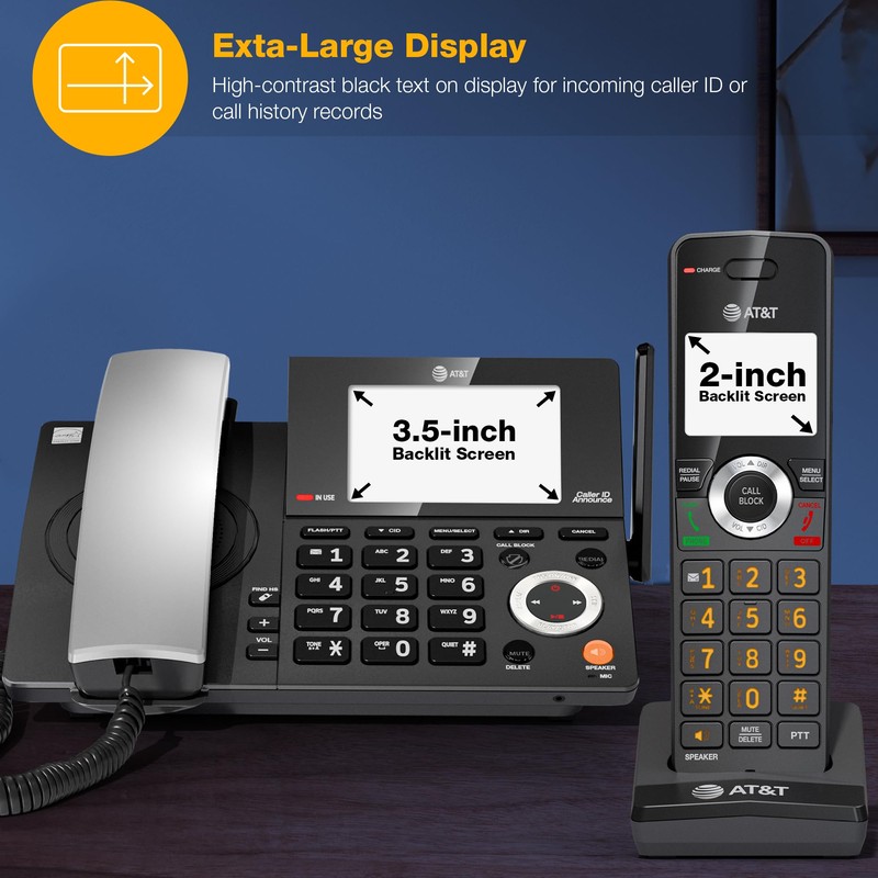 - [2" Handset & 3.5" Base backlit display] - High-contrast text on the 2" Handset & 3.5" Base unit extra-large display for easy viewing makes it easy to read incoming caller ID or call history records. Plus, the white back lighted handset keypad allows for easy dialing in low-light conditions.