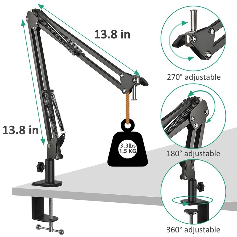 - Sturdy Mic Stand - The adjustable AT2020 microphone boom arm stand is made of durable steel for heavy duty carry. Max load: Approx.53oz/1.5kg. It offers 360° full rotation to hold your microphone in any position you like.