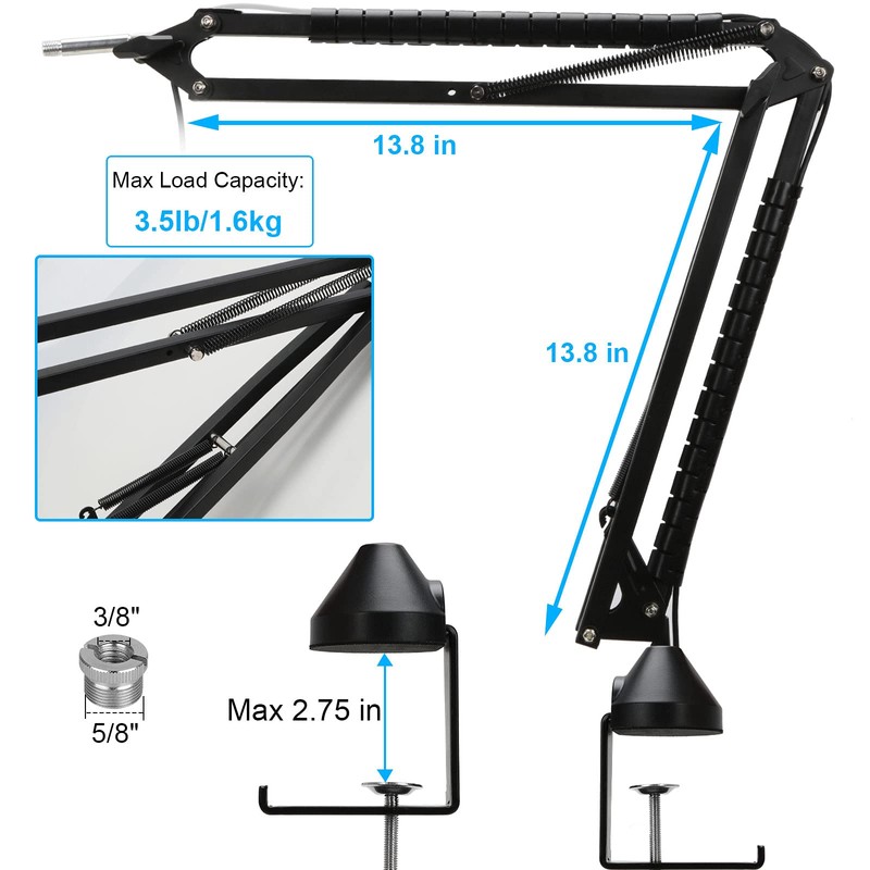 - Heavy Duty Construction - This microphone stand is made of durable steel for outstanding bearing capacity(3.53lbs/1.6kg). Dual suspension springs of each boom arm holds the mic right in place with no sagging, drop or jiggle.