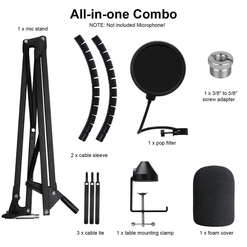 Mic stand is built with firm metal, double-braced arms and strong spring and can be used for different conditions. 180° foldable arm can be adjustable in full angle.