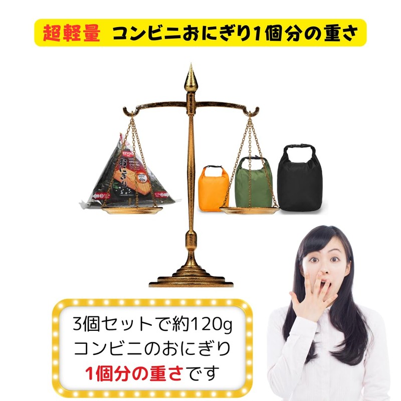 • (Ultra Lightweight Onigiri Weight) The total of 3 dry bags is approximately 4.2 oz (120 g). Approximately 1 rice bowl in a convenient store