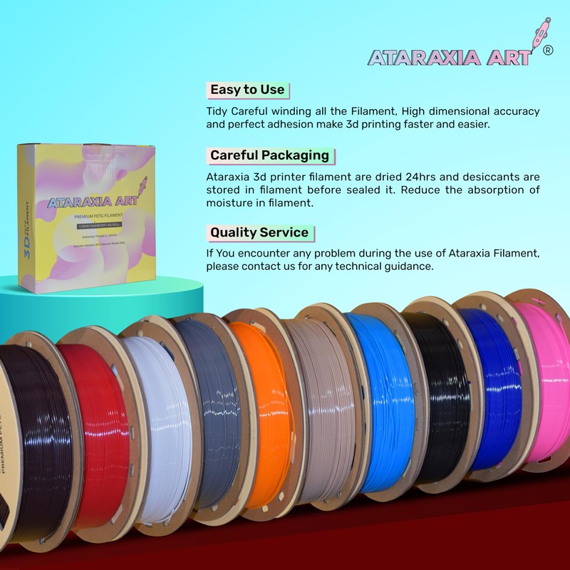 - ♚【 High-quality PETG filament】: Our Ataraxia 3D Printer PETG filament 1.75mm is made of tough material to enhance the premium quality for stable printing. It has a 1.75mm diameter, carefully wound, superb layer bonding, high purity, and low shrinkage. The advanced formula makes our PETG 3D filament impact strength extremely strong, perfect for printing functional models, special inventions, and strong gadgets.