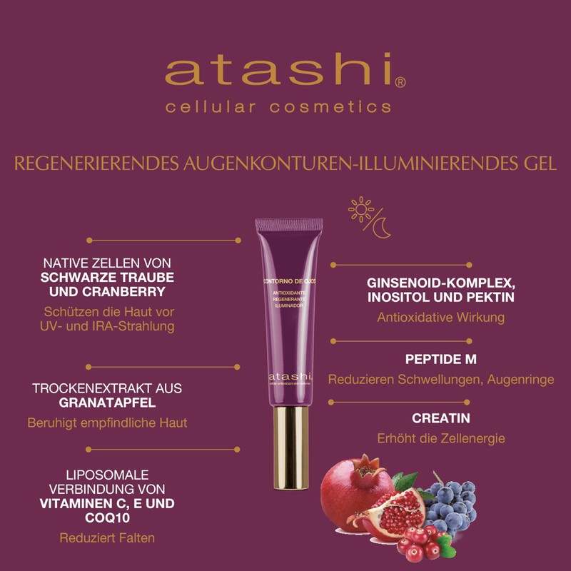 Atashi Antioxidant - Regenerating Eye Contour Gel with Brightening Effect - Reduces Fine Lines, Dark Circles, Puffiness - Soothes - Haloxyl, Vitamin C, E, CoQ10 - Sensitive Skin - 15 ml