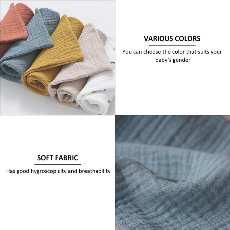- Selected material: The small towel is made of crepe fabric made of pure cotton, which has good moisture absorption and air permeability. It can quickly absorb baby's saliva or sweat, keep the baby's face and neck dry and reduce the discomfort caused by moisture and skin problems