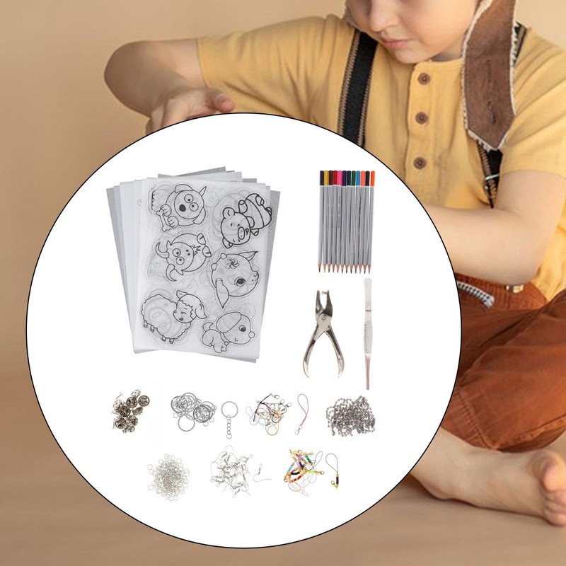 - 【Packing List】: 10 translucent heat shrink sheets (0.3 translucent fine grinding), 8 fill color heat shrink sheets, 1 hole puncher (6mm), 10 ear hooks, 12 water soluble colored pencils, 10 small keyrings, 100 open rings, 10 corn buckles, 10 lobster buckles, 10 pairs butterfly hats, 5 beads chain