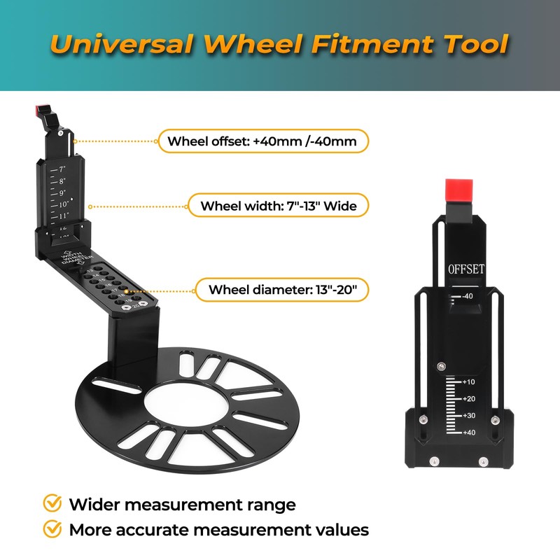 - Universal Compatiblity: Wheel fitment offset mearsuring tool compatible with All 4 and 5 lug hubs,fit for all Wheels from 13 to 20 inches.the Wheel width is from 7 to 13 inches and the Wheel offset is from -40mm to +40mm