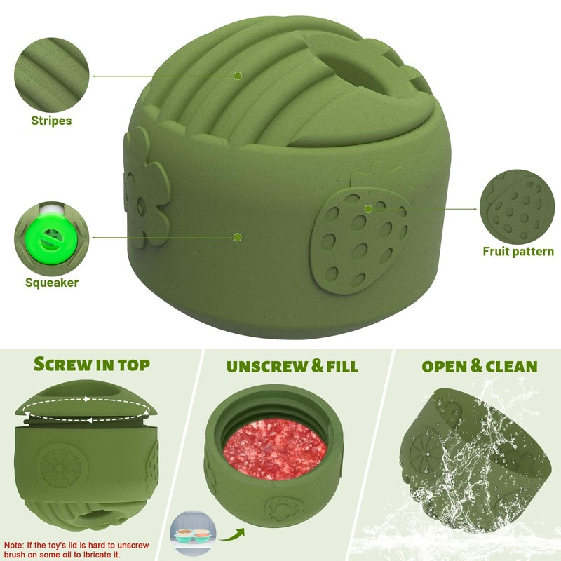 - Interactive Dog Toy with Squeaker, Dental & Teething Relief ------ Built-in squeaker keeps pets engaged while chewing, boosting excitement. Fruit-patterned, textured surface promotes effective teething and dental care. Ideal for playtime and mealtime, this dog enrichment toy provides fun and oral hygiene benefits for your furry friend.