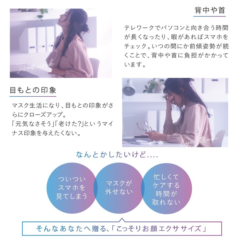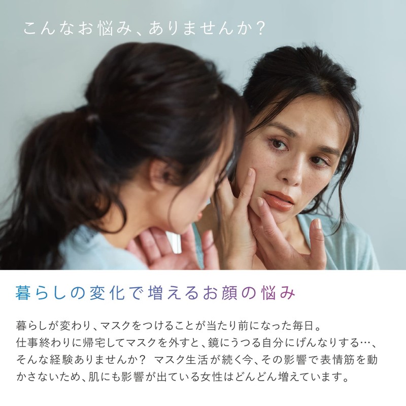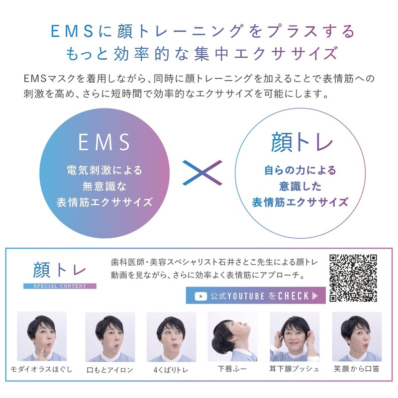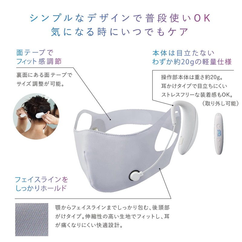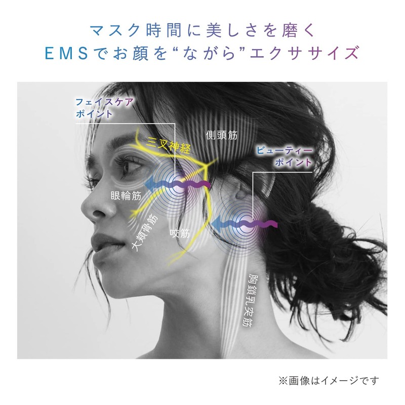 - Uniquely developed EMS that stimulates two points around the neck and face care. You will finally see your smartphone. The mask cannot be removed. It's busy and doesn't take much time to care for. This is a "secretly facial exercise" for you