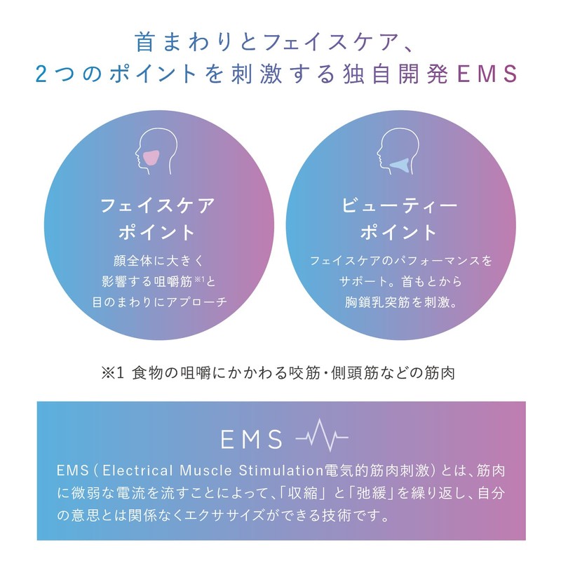 - Unique Developed EMS that Stimulate Neck and Face Care, 2 Points: Face Care Point: Chewing muscles that have a significant impact on the entire face *1 Approach around the eyes *1 Muscles such as biting muscles and careps associated with food chewing: Supports face care performance. Stimulates the chest chain mammy muscles from the neck