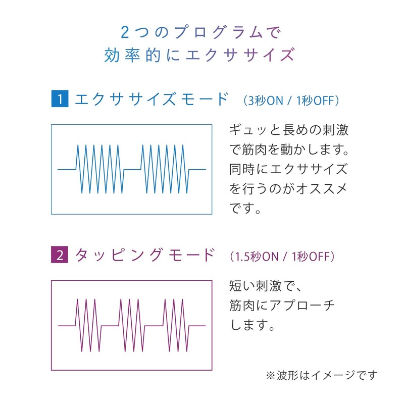 - (2 Programmes for Efficient Exercise) Exercise Mode (3 seconds on and 1 second off): Promotes muscle movement with extended stimulation. It is recommended that you do exercise at the same time. Tapping mode (1.5 seconds on/1 second off): It approaches muscles with short stimulation