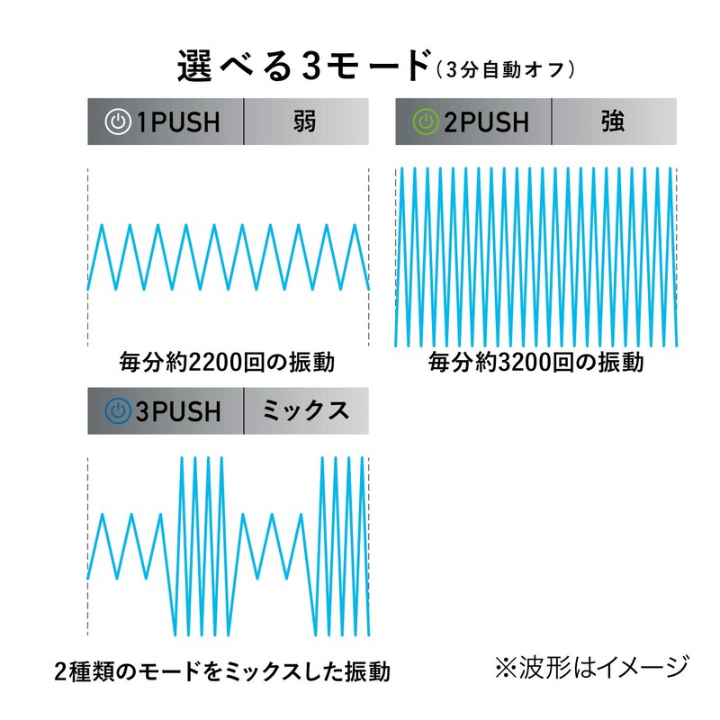 - 3 Modes to Choose from 1 Button: 1 PUSH (Weak Mode) → Approx. 2200 Vibrations per minute, 2 PUSH (Strong Mode) → Approx. 3,200 Vibrations per minute, 3 PUSH (Mix Mode) → Mixed 2 Modes
