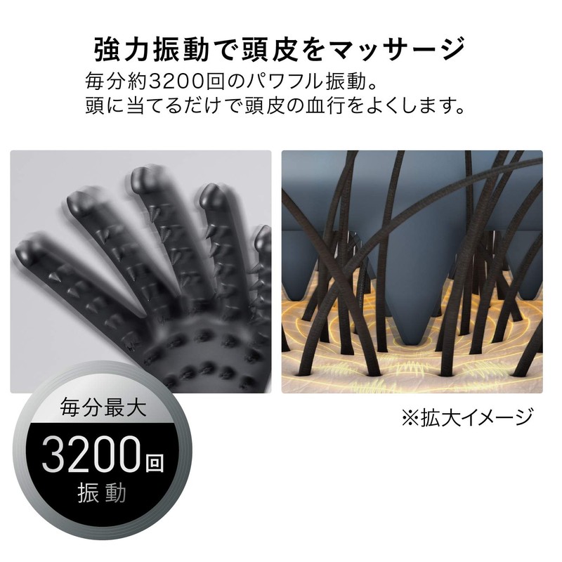 - [Massages the scalp with cooperative vibration] Powerful vibrations about 3,200 times per minute. Just place it on your head to increase blood circulation of your scalp