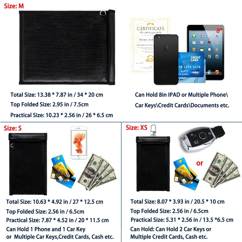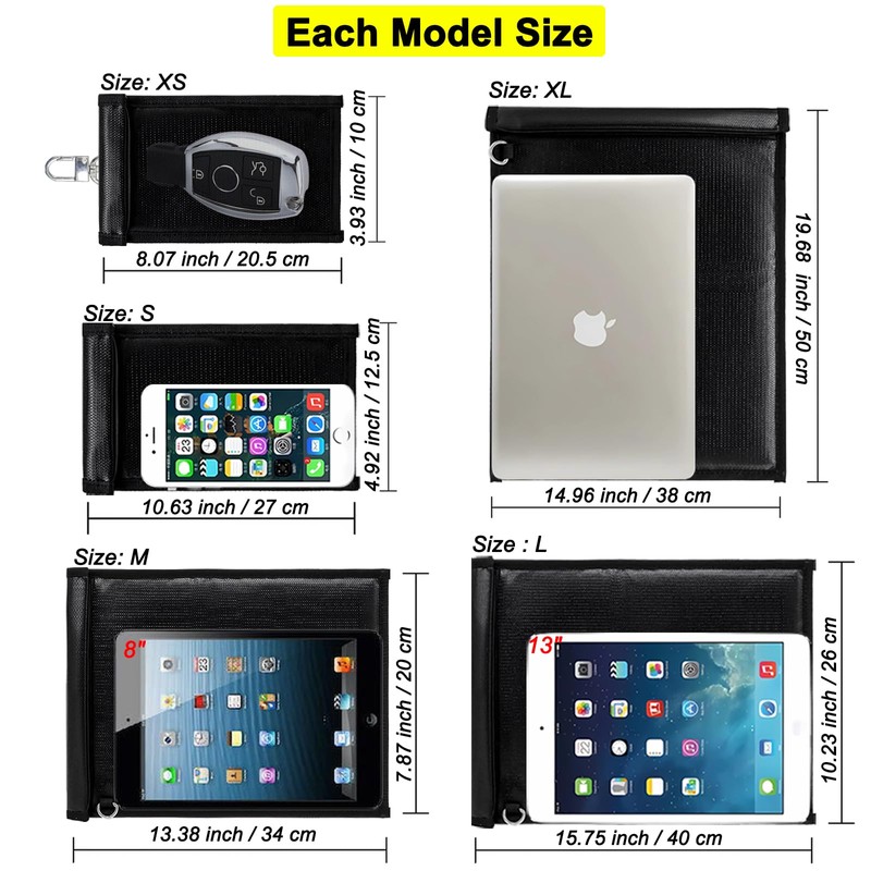 • Versatile Sizes - The Faraday fireproof bag have 5 sizes - XS - 8.2 * 3.9 in, S - 10.6 * 4.9 in, M - 13.3 * 7.8in, L - 15.7 * 10.2 in, XL - 19.6 * 14.9in. Please choose the size that best fits your needs. These bags size are perfect for storing your most important documents and valuables, including passports, birth certificates, marriage certificates, social security cards, licenses, contracts, cash, jewelry, letters, precious photos, laptops, USB disks, CDs, deeds, and more.