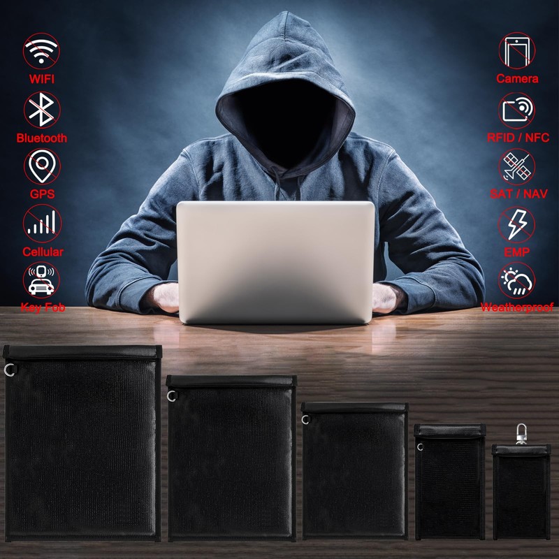 • Securit & Safety & Privacy - Feel secure knowing that wherever you travel in the world, your personal information cannot be compromised by electronic pickpocketing thieves. The Faraday lsolating bag instantly suppression Cellular, GPS, WiFi, Bluetooth, RFID and NFC, EMR, EMF, Radiation, and Key Fobs. It's a simple and effective way to easily protect yourself against the growing risk of identity theft.