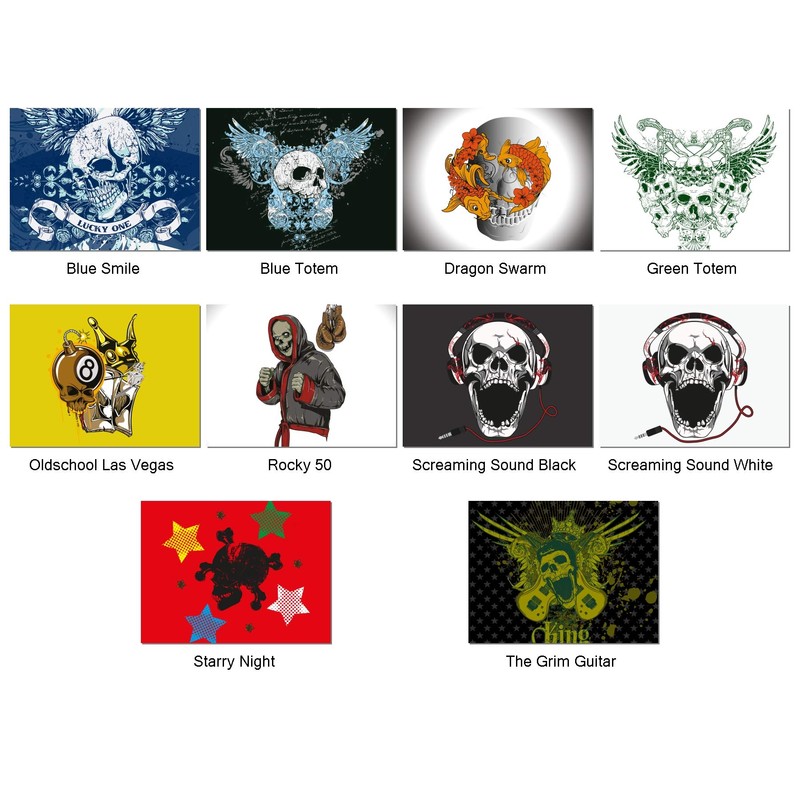 Choose your favourite design in the online configurator: Blue Smile, Blue Totem, Dragon Swarm, Green Totem, Oldschool Las Vegas, Rocky 50, Screaming Sound Black, Screaming Sound White, Starry Night, The Grim Guitar