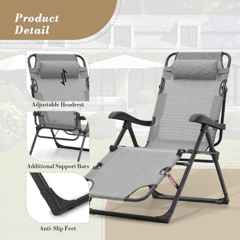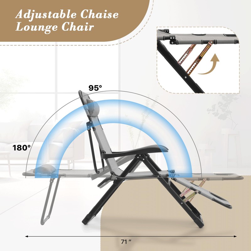 • Comfort: The folding chaise lounge chair set of 2 offers adjustable recline angles and a cushioned headrest for ultimate relaxation. Its ergonomic design improves circulation and reduces spinal pressure.