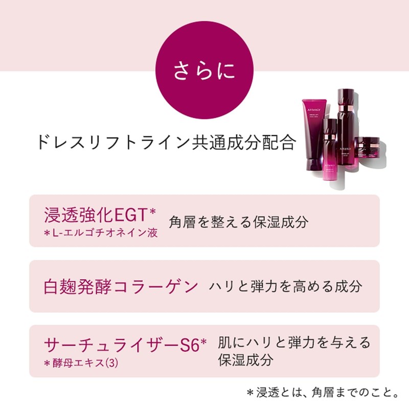 - Aging care that challenges a new area of penetration: Dress Lift, medicinal and aging care line (excluding facial washing). The ingredient "Penetration *Reinforced EGT*" is formulated in all items that lead skin care to permeate and maintain its ability to maintain its own state. With an unprecedented approach to adjusting skin acceptance and penetration * Increases efficiency and provides a refreshing and refreshing feeling to your skin. * Penetration refers to the square layer. *Aging care is based on age care. *L-ergothionine liquid that softens and smoothes down hard and thick corners