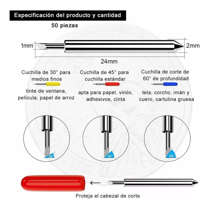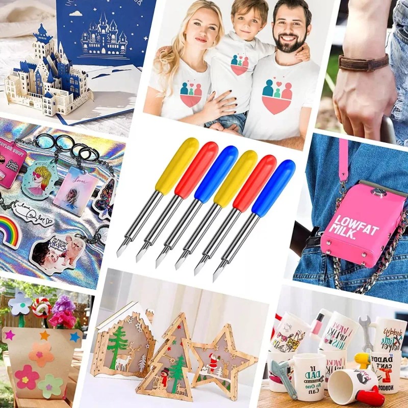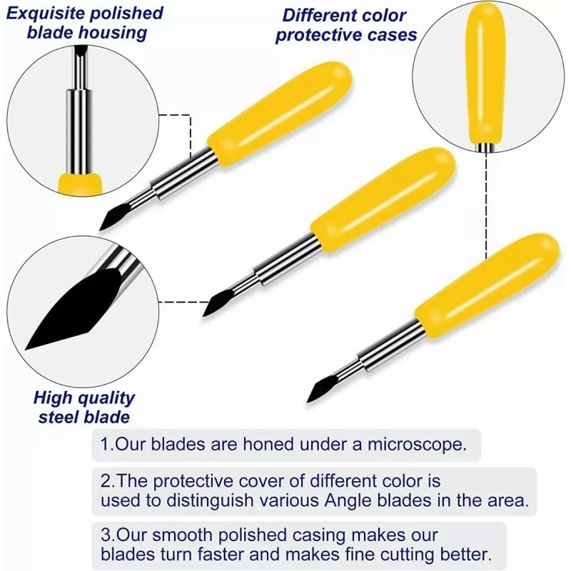 Efecto de corte en 3 tamaños: Hay 3 tamaños diferentes de agujas de corte para cortar diferentes materiales, 30 hojas para medios finos: película de ventana, película, papel de arroz, 45 hojas para papel estándar, vinilo, pegatinas, lámina adhesiva y 60 hojas para medios profundos: tela, corcho, imanes y cuero, tarjeta gruesa. Puede elegir el tamaño que necesite según sus necesidades. Cada juego contiene 50 cuchillas en su interior.
